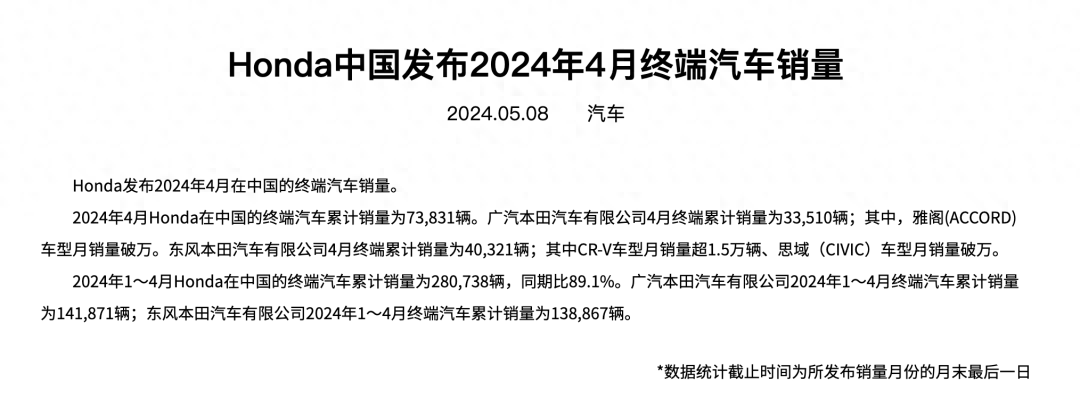 最新銷量數據透露,本田在華遭遇"雙重危機"——燃油車持續飄綠,電動車陣容又難覓突破。2024年4月,本田在華終端銷量7.38萬輛,同比大跌22.18%;1-4月累計銷量28.07萬輛,也同比下滑10.9%,延續了近幾年的頹勢。