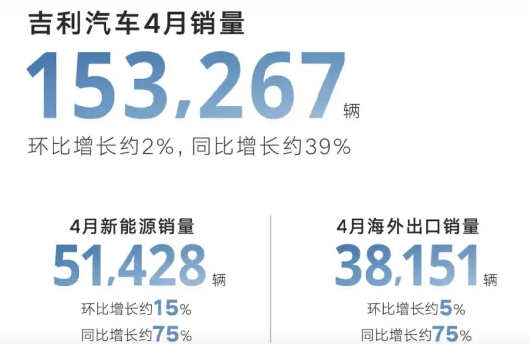 吉利汽車4月銷量153,267輛,環比增長約2%,同比增長約39%。4月新能源銷量為51,428輛,同比增長約75%,4月海外出口銷量為38,151輛,同比增長約75%。吉利銀河4月銷量12,725輛,環比增長約25%;領克品牌4月銷量為18,727輛,同比增長約34%;極氪品牌4月銷量為16,089輛,同比增長99%。海外出口方面,4月銷量為38,151輛,環比增長約5%,同比增長約75%。