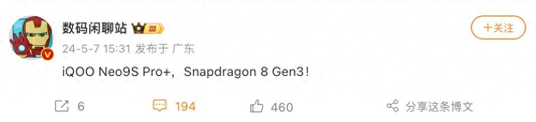 5月8日消息,iQOO Neo9S Pro/Pro+將在本月發布,官方先前曾宣稱Neo9S Pro將搭載聯發科天璣9300+處理器,而根據博主@數碼閑聊站 的最新曝光的消息顯示,iQOONeo9S Pro+將采用高通驍龍8 Gen3處理器。