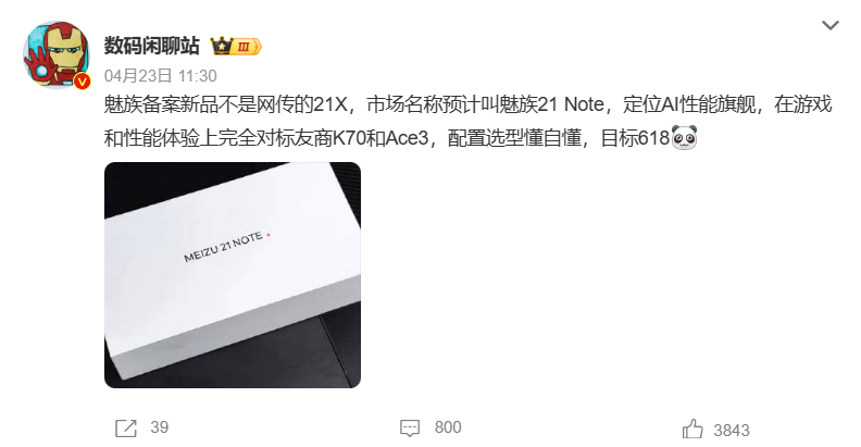 知名博主“數碼閑聊站”表示,魅族21 Note定位AI性能旗艦,在游戲和性能體驗上完全對標友商的Redmi K70和一加Ace 3,目標是618。