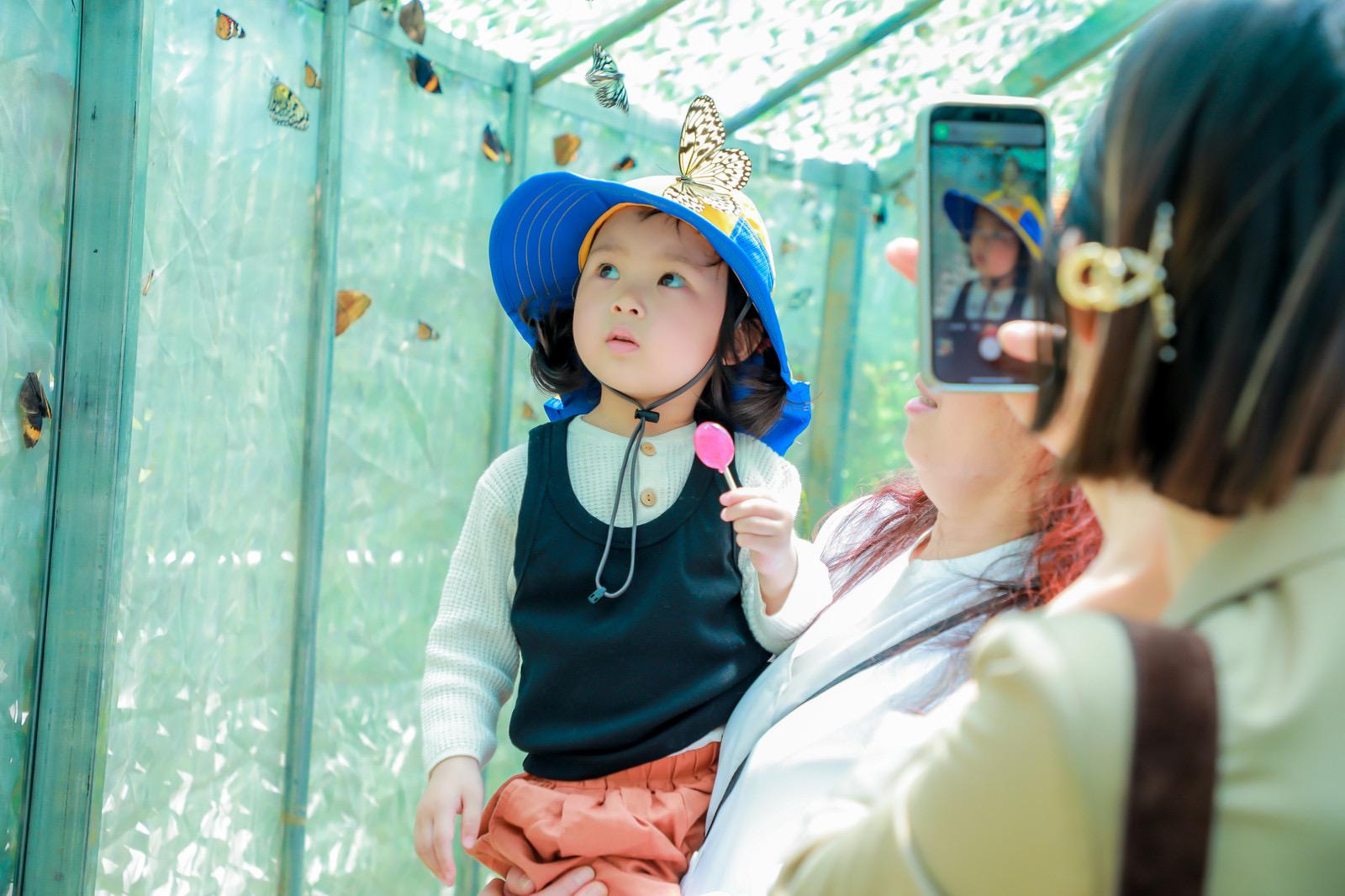 最近,走在上海長寧區(qū)愚園路上的人會發(fā)現(xiàn)一頂特別的大帳篷,走入其中,成片花蝴蝶流連鮮花間,不時也停到人的指間,惹人喜愛。