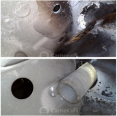 通過內窺鏡從潰縮孔伸進去,焊接的痕跡不要太明顯,都燒焦了!調整角度之后竟然還發現一根鋼管!不過呢大家也不要太過差異,這都屬于是老手段了,很多結構件的切割里面都會加一根鋼筋或者鋼管來增加強度,避免受到顛簸直接斷掉!而這臺車的切割點剛好就在發動機機腳的固定位置,試想一下,要是跑著跑著發動機突然掉了那不出大問題嗎?