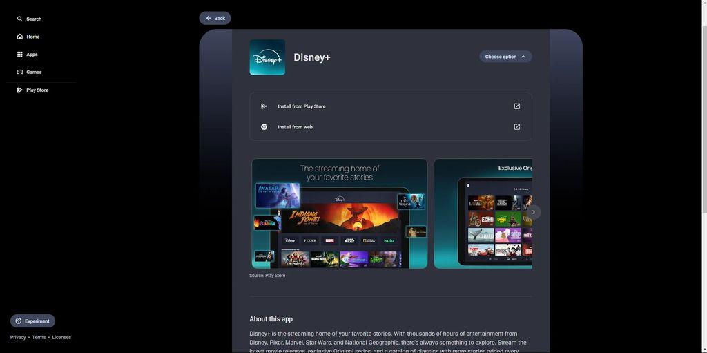 用戶選擇打開某款應(yīng)用之后,應(yīng)用商城會提供詳細(xì)說明、屏幕截圖和安裝選項。應(yīng)用程序可能僅通過 Play 商店提供,或者下拉菜單讓用戶選擇 Web / PWA 版本和版本安裝。