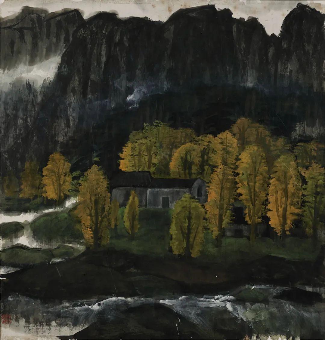 正如這幅《山溪》,林風眠用方紙布陣,畫面構成符合西畫的透視原理,從前景中的溪石,到中景的秋林屋舍,再到遠景中層疊的群山,層層展開,隱含著嚴密的層次感,整飭、凝重,和畫面總體幽暗的色彩相配合,形成一種深遠幽邃的效果。