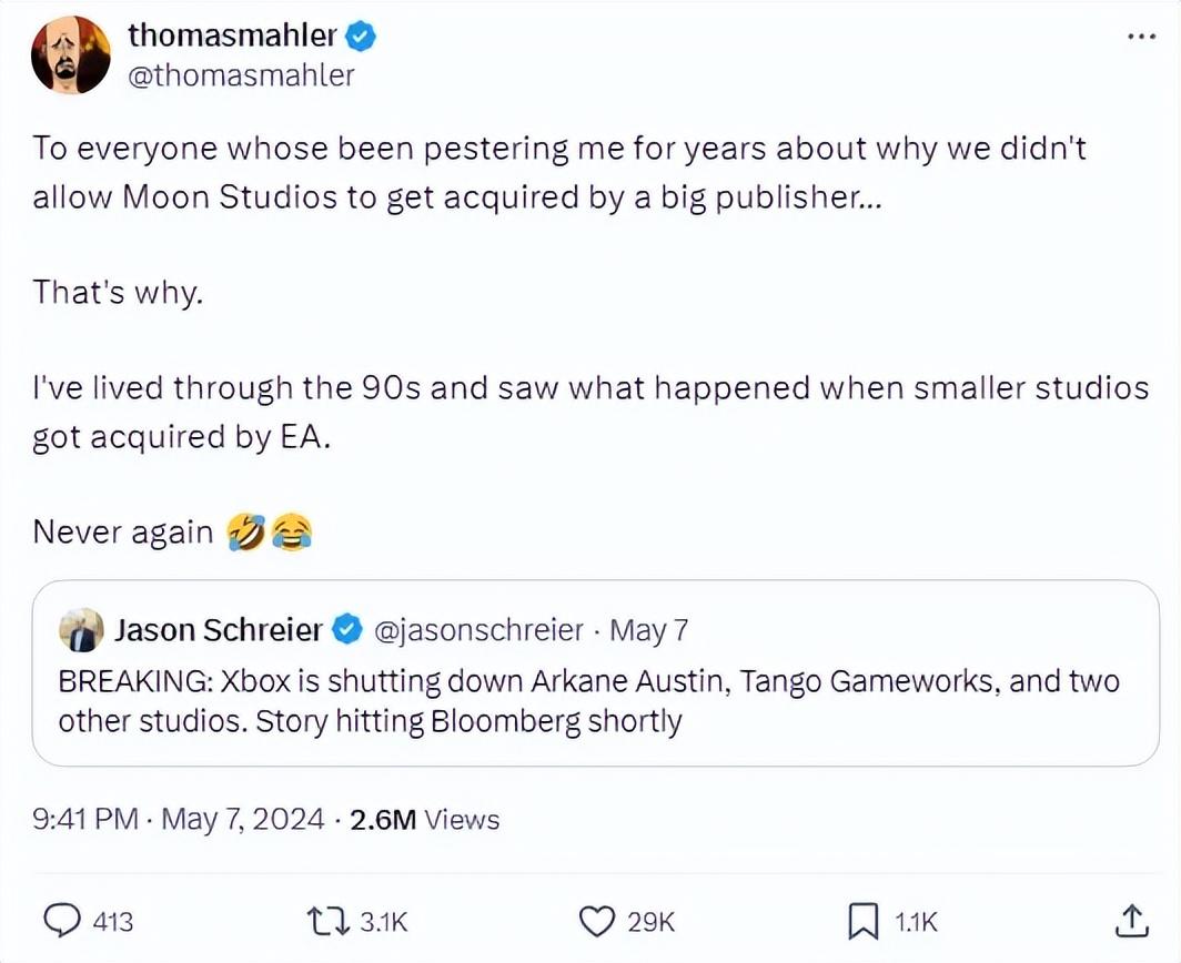 開發過奧日系列、曾與微軟關系密切的月亮工作室CEO Thomas Mahler,則以一副后怕的口吻在社交媒體上感慨:“這就是我不讓自己工作室加入任何一個大公司的原因。曾經EA就干過類似的事,如今不過是老橋段重演罷了。”