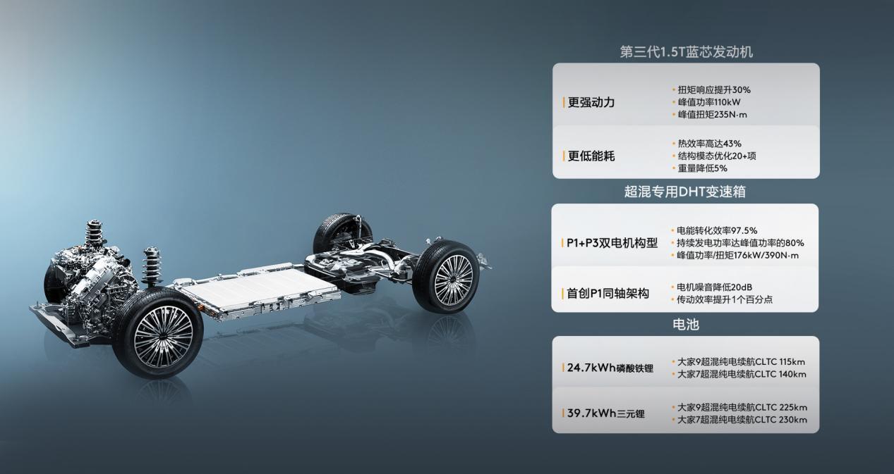 該技術集1.5T混動專用發動機、專用DHT變速箱和高能量密度電池等先進動力系統于一身,其中發動機熱效率達到了行業領先的43%,超越了眾多同類型發動機,電機的發動效率也達到了97.5%,兩者結合帶來了超長續航。在油電混合模式下,大家9超混CLTC綜合續航可達1309km,大家7超混更達到了1327km。