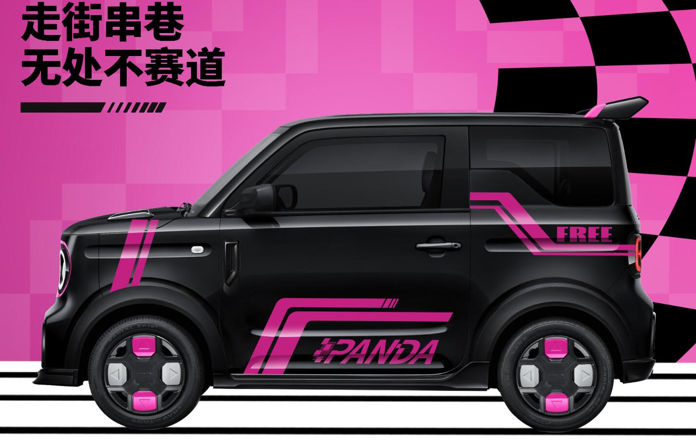 車身側面,新車采用了撞色車身懸浮式車頂設計,并在A柱下方加入了特殊的黑色裝飾補充,輪轂有著獨特的雙色布局,側裙處也有一些額外的護板與車頭的設計形成對應,同時提供競速黑冒險白狂飆灰等多種車漆,并針對不同的車企采用了不同的撞擊方式進行補充。限定時間下訂還可以贈送熊貓卡丁粉紅風暴車貼,進一步增強辨識度。
