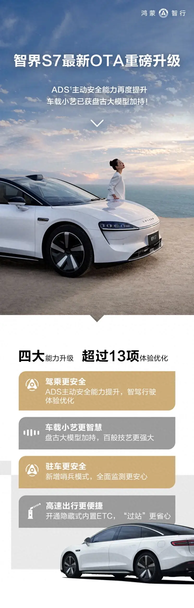 如今新能源汽車也像軟件一樣,時不時需要“補丁”升級下,那要是按照話術來說,那就是OTA升級。通過不斷地軟件升級,在車輛的功能性體驗及加成體驗上也會有卓越的提升。近日,智界汽車官方宣布旗下純電中大型轎車智界S7就迎來OTA重磅升級,此次升級針對智駕和車載小藝語音助手進行優化,并新增了哨兵模式和隱藏式內置ETC,同時還超過有13項體驗優化。
