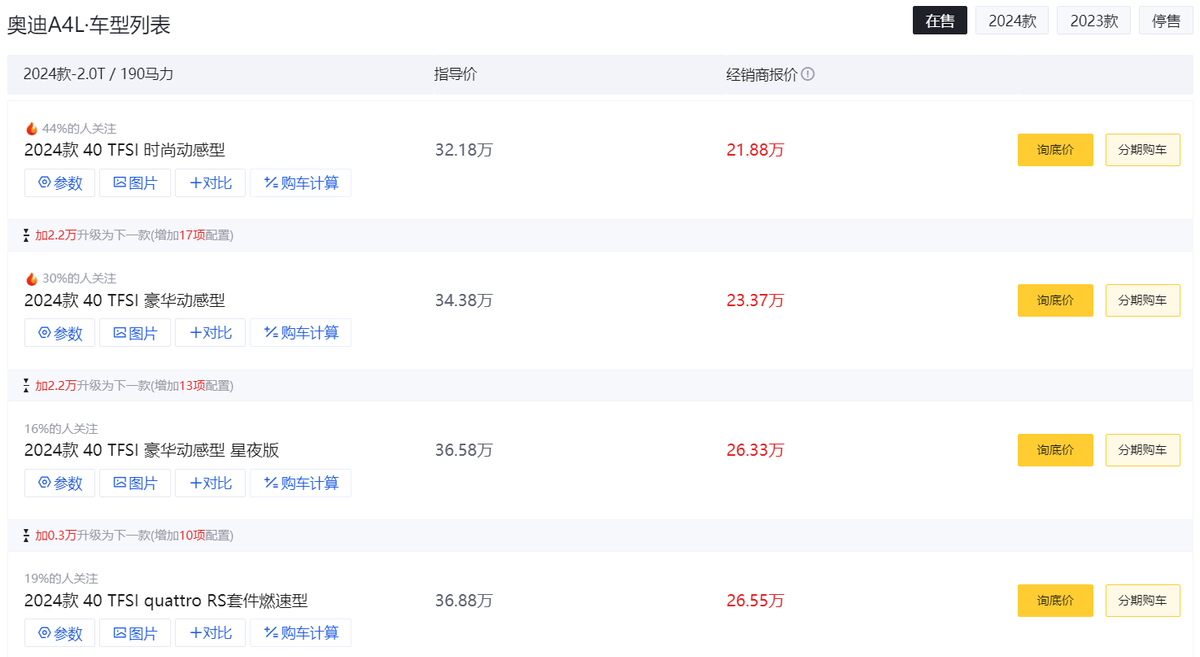 至于值不值得買,我覺得還是要考慮到它的售價。根據查詢回來的信息,奧迪A4L目前普遍都能做到優惠10萬左右,如果誠心要買,估計終端還會有更大的優惠幅度。換言之40時尚低配版本目前落地價有望在23-24萬左右,哪怕是40豪華,落地價也有機會能做到25萬左右。要知道放在幾年前,40豪華落地還需要30多萬。以目前這個價格去考慮,我認為A4L還是有一定的可取性的,但前提就是你要做好它隨時可能會改款換代的準備。