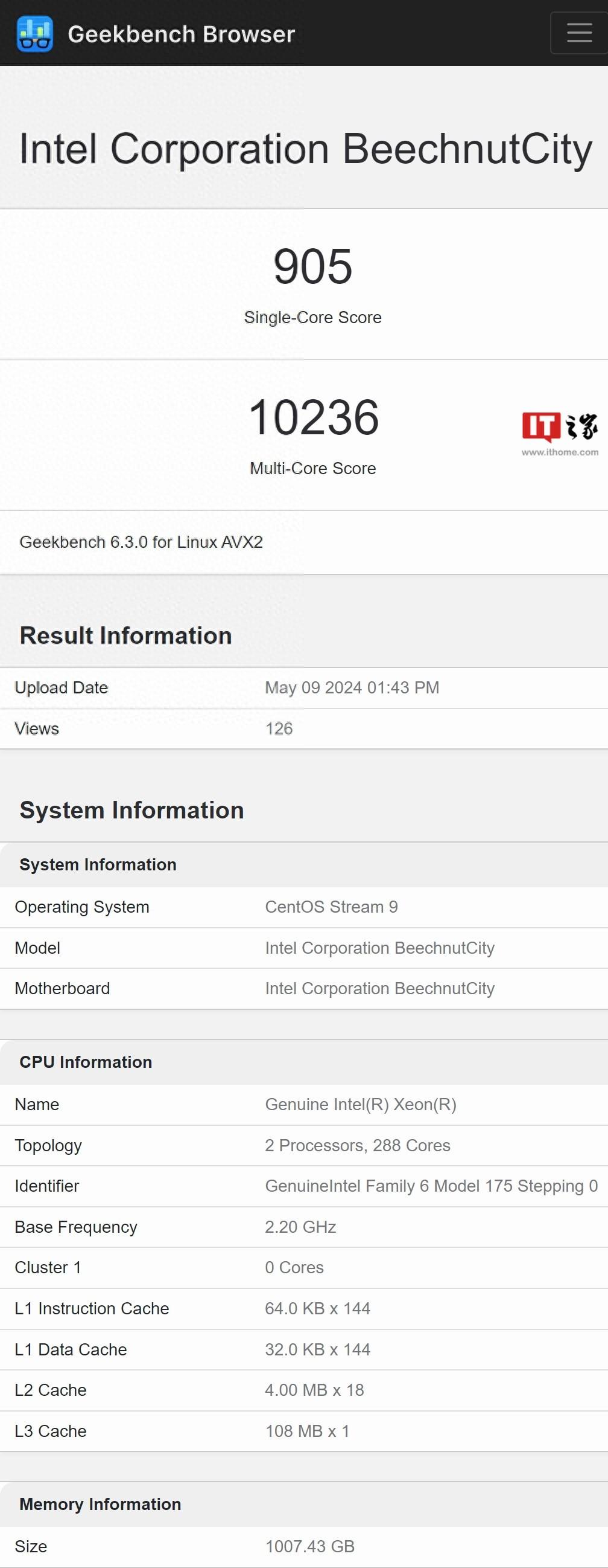 該測試樣本采用英特爾 Beechnut City 測試主板平臺,運行 CentOS Stream 9 操作系統,整體內存容量超過 1000GB。
