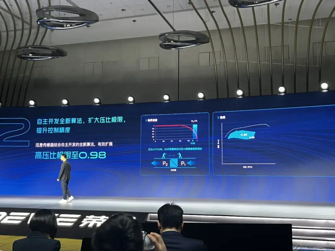 此外,上汽還開(kāi)發(fā)了全新算法,擴(kuò)大壓縮比極限,提升控制精度。通過(guò)壓差傳感器結(jié)合自主開(kāi)發(fā)的全新算法,有效的擴(kuò)展高壓縮比極限至0.98,而業(yè)內(nèi)一般在0.95。