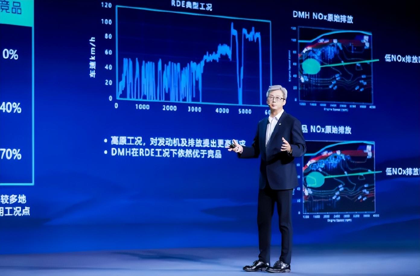 其次,DMH擁有更高熱效率占比,由于具有多檔位優(yōu)勢(shì)。DMH能夠較多地在發(fā)動(dòng)機(jī)最佳經(jīng)濟(jì)區(qū)運(yùn)行客戶(hù)常用工況點(diǎn)。其中,熱效率大于41%和40%的占比分別達(dá)到了35%和50%,遠(yuǎn)超競(jìng)品。最后,DMH擁有更好的RDE排放。