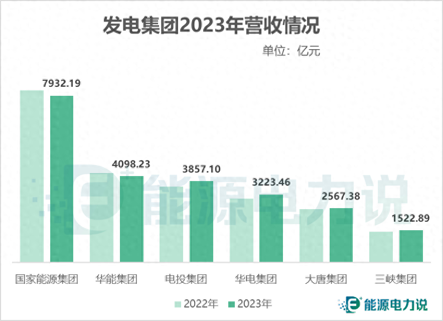 營收方面,2023年國家能源集團領先達7932億元,其次是華能4098億元,電投3857億元;同比增幅方面,電投增幅最大達6.97%,華電增長6.32%,三峽增長4.12%,大唐也有少量增幅1.66%;國家能源集團、華能集團有略微下降。