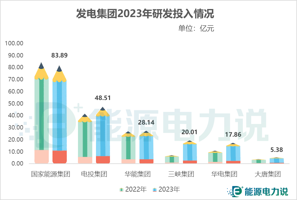 研發投入方面,2023年國家能源集團研發投入最大達83.89億元,其次是電投集團48.51億元,華能集團、三峽集團研發投資均超20億元。