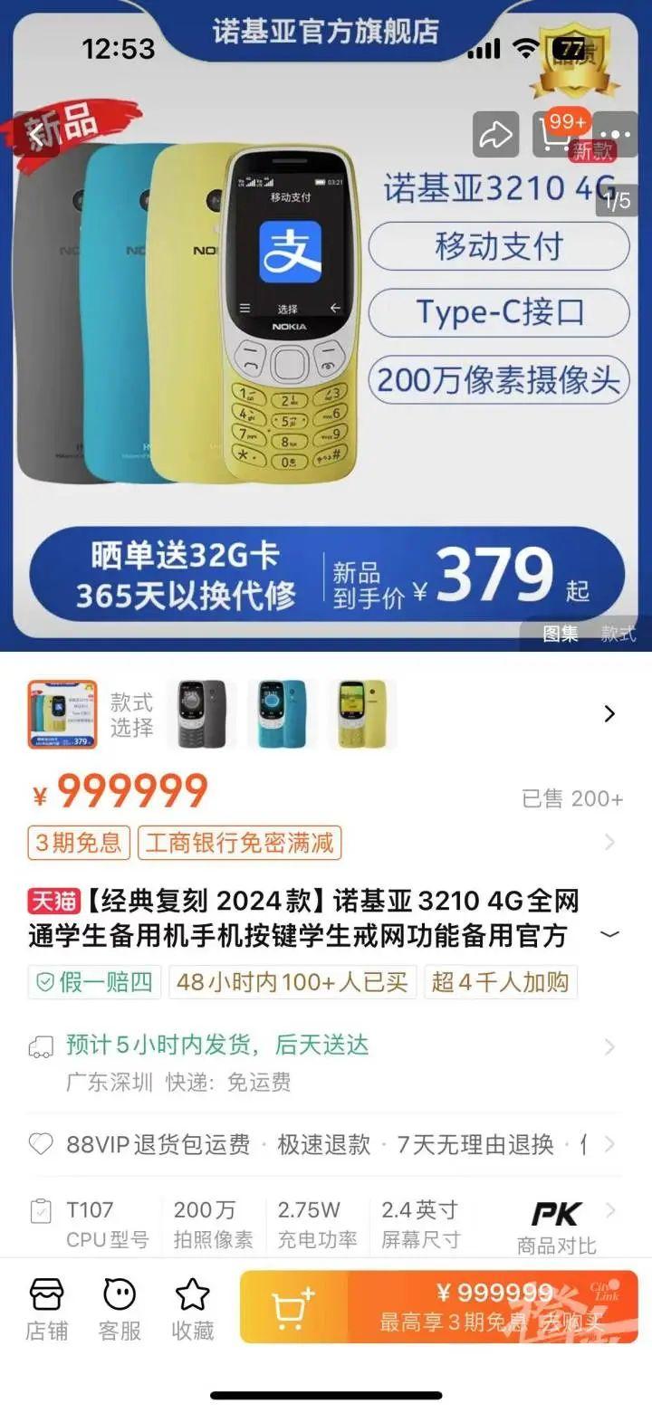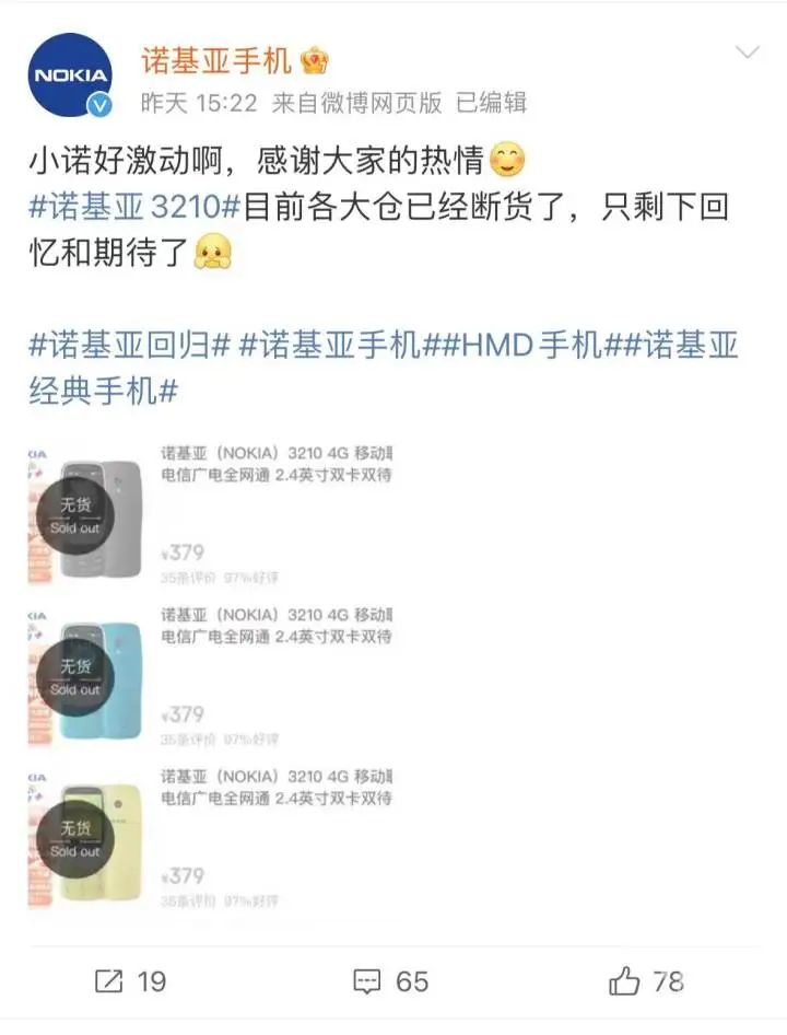 目前,這款手機的官方售價是379元。就在發布當天,諾基亞手機官方微博宣布,首批諾基亞3210 4G已經全部售罄。