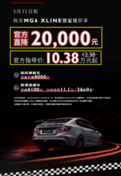 或許是因為受到了持續性的銷量低迷影響,近日,上汽名爵MG6 XLINE獵鯊版車型現已官方降價2萬元,如此一來,新車在終端的價格也從12.38萬下降到了10.38萬元。并且,廠家同時還提供了至高8000元的以舊換新補貼,至高6100元、日供低至11.1元/36期0息的貼息金融禮,而活動截止時間則是到2024年的5月31日。