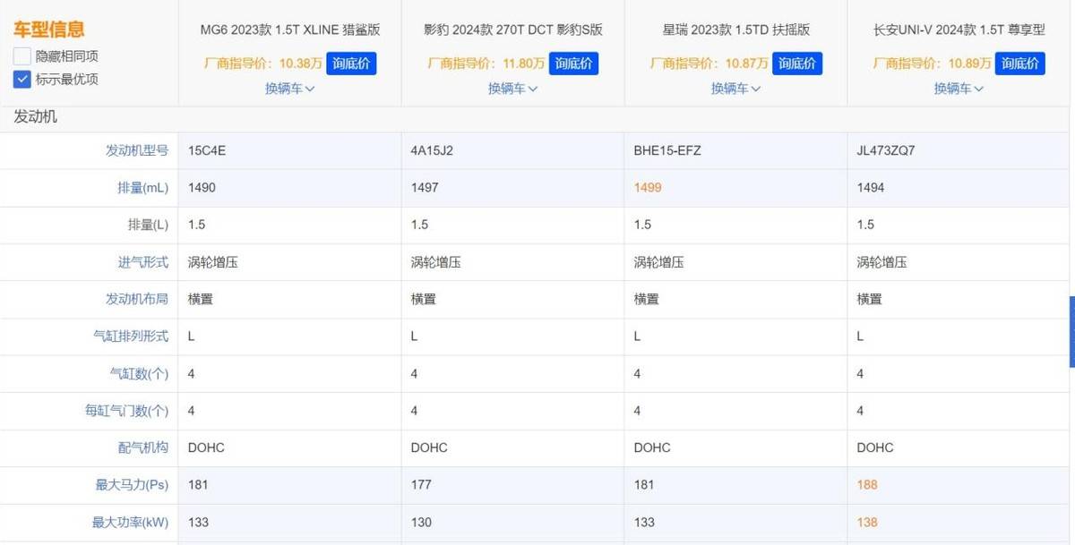 但只要一對比下來你就會發現,名爵MG6 XLINE的馬力和扭矩是不如隔壁家的1.5T星瑞和1.5T長安UNI-V車型的。再加上后面兩位選手在配置上的表現要更占優,因此消費者在做選擇時也很難不被后者所吸引,而這便正是名爵6車型始終在銷量方面始終都上不去的一個很重要原因。