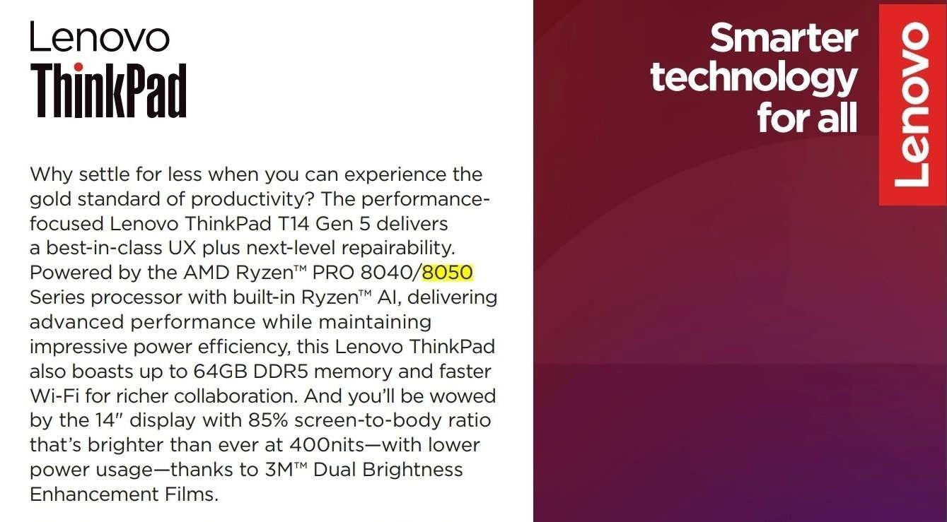 但這又引來了另一個問題:AMD 常常會在同一代產品中引入不同的工藝,而這套「全新」的命名法則中并未有標示制程工藝的位置。照這么看,這個全新的 AI 編號甚至還不如過去的「7640U」編號法。而且這還只是 Ryzen「主線」的命名方式,根據被曝光的聯想新品介紹頁,商用產品還保留著 Ryzen PRO 8040/8050 這一套命名體系,場面一度十分混亂。