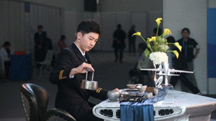 身為空乘專業的學生,先前的技能訓練也給謝嘉欣打下了表演項目的基礎。不需要怎么教學,他就已經能出色把控自己的儀態和表情,這在茶藝表演中同樣重要。