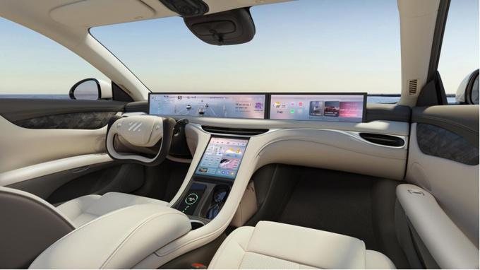 而走進智己L6的車內,屏幕幾乎完全充斥了你的視野。26.3英寸主屏和15.5英寸副駕屏橫跨整個中控。同時下方還配有一塊10.5英寸操作屏,構筑了T型布局的矩陣。雖然目前所展示的車型配備了半幅方向盤,但同時也有傳統方向盤可選。