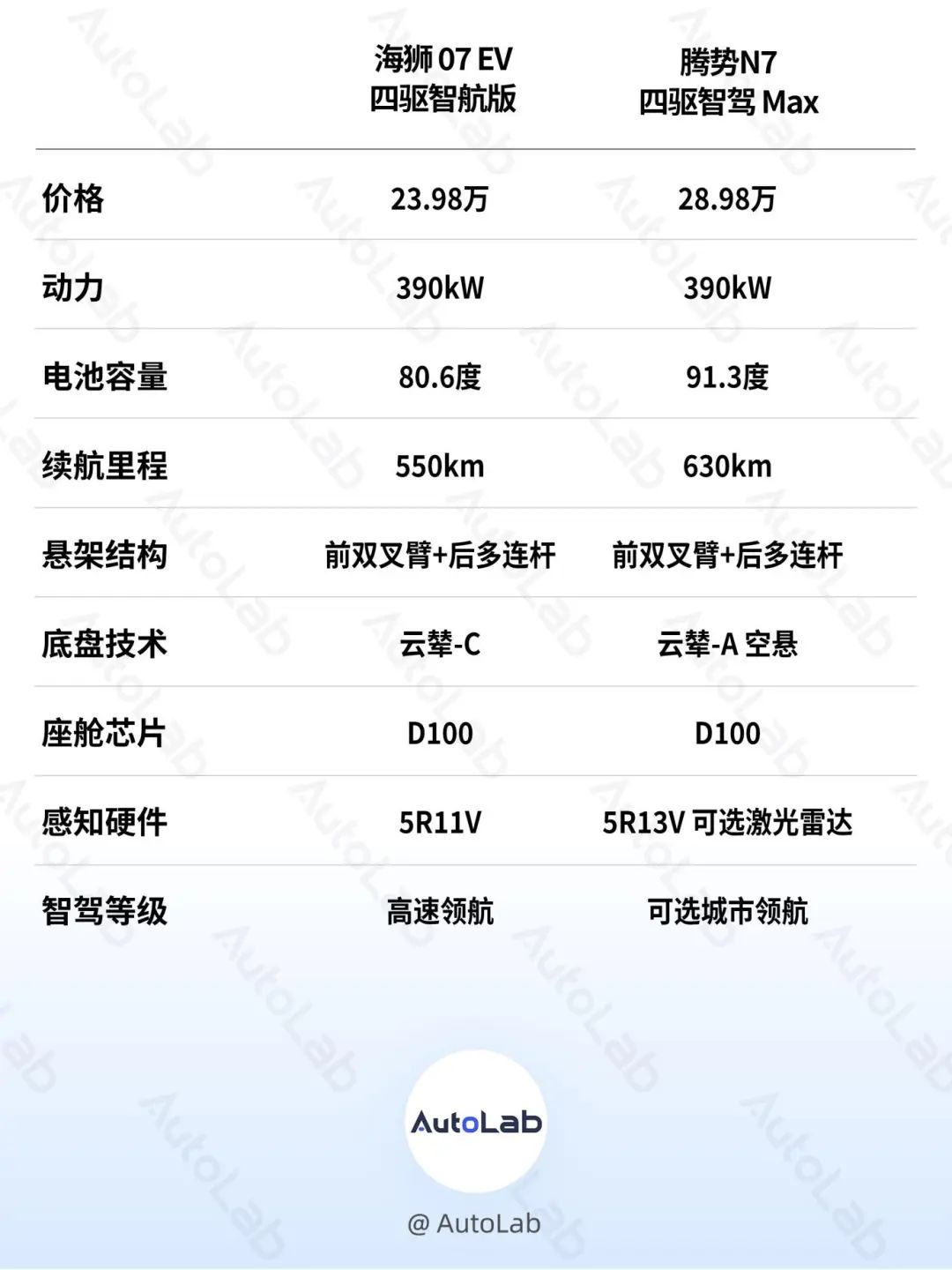 我們選取了海獅 07 EV 四驅智航版和它的老大哥騰勢 N7 四驅智駕 Max 版本來進行對比,一樣都是四驅車型,看看選豪華品牌多花的 5 萬塊錢能給你帶來些什么提升。