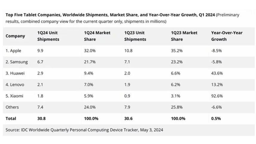 所以一直以來,蘋果的iPad銷量、市場都是遙遙領先,全球沒有對手的,而2024年一季度的數據也顯示了如此,哪所華為、小米、聯想這三大國產品牌加起來,都遠遠不如蘋果的iPad。
