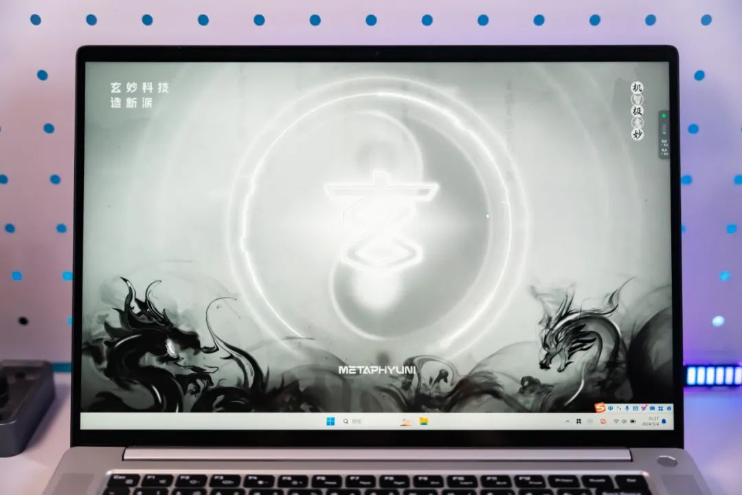 開機之后默認壁紙是玄派專為俠氪輕薄本設計的專屬壁紙,融合了道家太極元素,有一種特別的國風美感。不過壁紙還不是重點,真正讓我驚艷的是極窄的屏幕邊框,在尺寸固定的情況下邊框越窄屏占比越高,視覺觀感也越好。