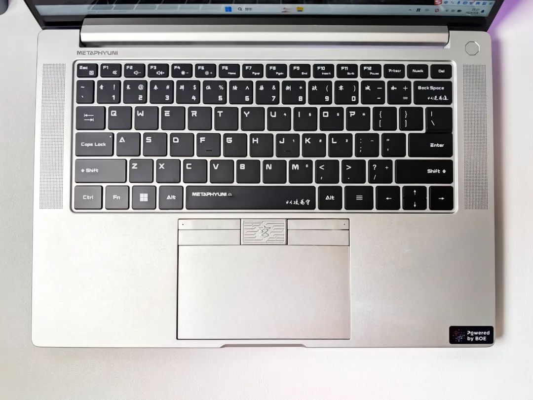 雖然玄派俠氪整個機身尺寸不大,但鍵盤和觸控板規劃的空間還是蠻大的,這樣打字的時候不會擁擠,操控觸控板也不至于太局促。鍵盤右下角還有一個“Powered by BOE”標簽,說明這款輕薄本的屏幕使用了京東方的高端顯示技術。