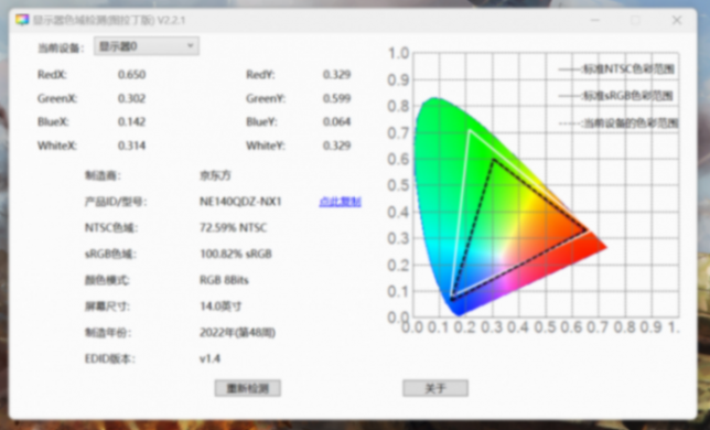 標示的屏幕色域為100%sRGB,我這里用工具檢測了一下,確實是100%sRGB高色域。