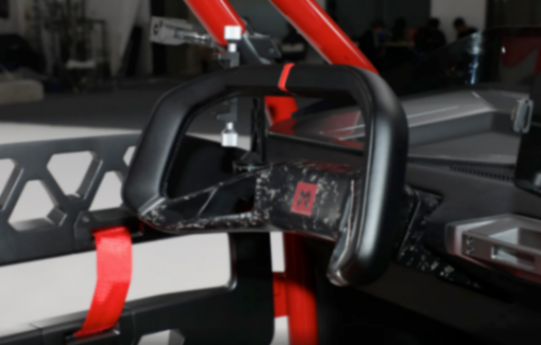 全車覆蓋大面積碳纖維材質,前包圍處還加以鋼制護杠設計,再加上兩個紅色拖車鉤以及中置電機絞盤裝置,用事實向大眾證明它可不是只會花架子。車身側面和車尾都是開放式鏤空設計,也就是說沒有傳統的車窗車門,內飾設計布局一目了然的呈現在面前。因此東風猛士M-HUNTER采用管狀車身結構設計,放棄了傳統車門,轉而用更加簡約的護杠造型。看起來野性十足,當然這樣的設計也注定了它不適合在常規路面行駛,合不合法也是另一種說法。
