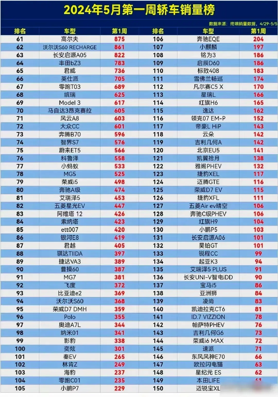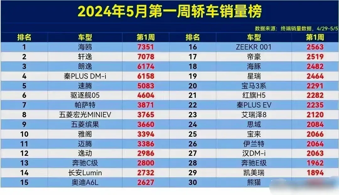 1~30排名,海鷗、軒逸、朗逸、秦PLUS DM-i、速騰銷量都超過5千輛,驅逐艦05、帕薩特、五菱宏光MINIEV、五菱繽果、雅閣、邁騰都在3千輛以上,逸動、奔馳C級、長安Lumin、奧迪A6L、ZEEKR001、帝豪、海豚、星瑞、寶馬3系、紅旗H5、秦PLUS EV、艾瑞澤8、思域、寶來、伊蘭特、漢DM-i都超過2千輛,奔馳E級、凱美瑞、熊貓在1千多輛。