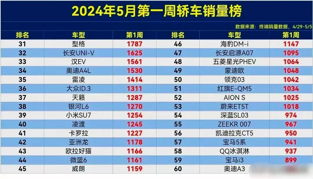 再來看一下31~60排名,型格、長安UNI-V、漢EV、奧迪A4L、雷凌、大眾ID.3、天籟、銀河L6、小米SU7、凌渡、卡羅拉、亞洲龍、歐拉好貓、微藍6、威朗、海豹DM-i、長安啟源A07、五菱星光PHEV、蒙迪歐、領克03、紅旗E-QM5、AION S、蔚來ET5T銷量都超過1千,深藍SL03、ZEEKR007、凱迪拉克CT5、寶馬5系、QQ冰淇淋、寶馬i3、奧迪A3都在8百輛以上。