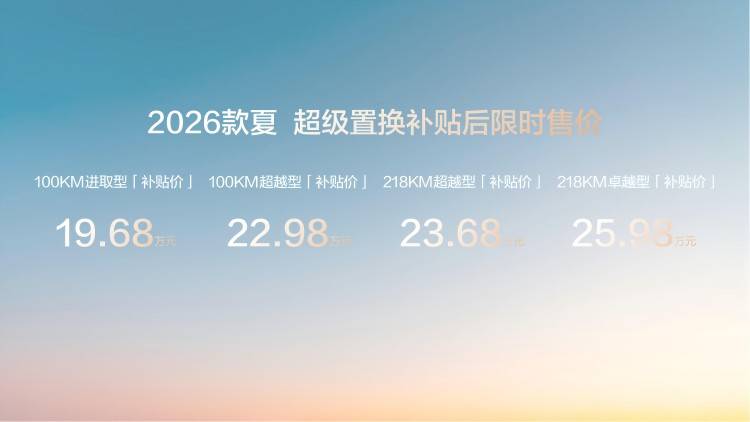 作為家庭用車終極選擇,2026款夏于11月4日上市,4款車型限時超級置換價19.68—25.98萬元。頂配可選裝含AR投影感應開啟、28揚音響等配置的舒享包,兩款定制雙色車身限時僅需6000元(原價2萬元),以中級SUV價格帶來30萬級豪華體驗。