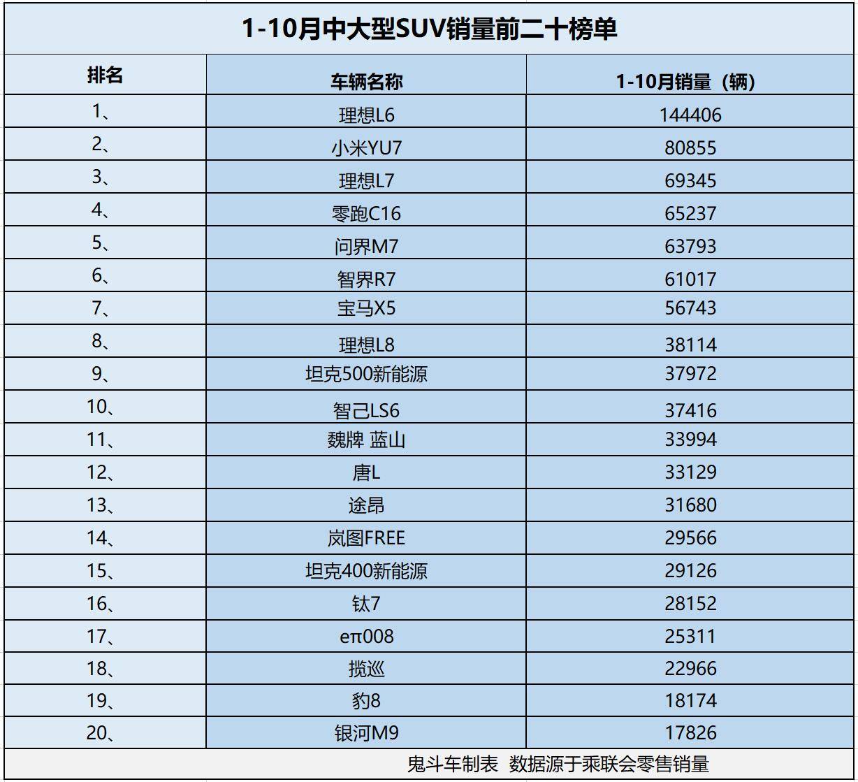 此外,進入1-10月中大型SUV銷量排名前二十榜單的車型還有坦克400新能源、鈦7、eπ008、攬巡、豹8以及銀河M9,這些SUV車型1-10月累計零售銷量都在17000輛以上。