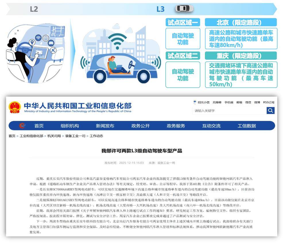 12月15日,工業和信息化部正式公布我國首批L3級有條件自動駕駛車型準入許可,兩款分別適配城市擁堵、高速路段的純電車型將在北京、重慶兩地指定區域開展上路試點,標志著我國自動駕駛正式進入L3時代。