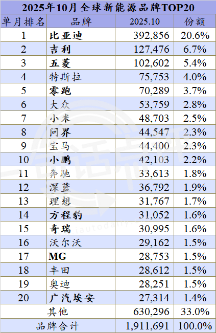 ●比亞迪10月以39.3萬輛繼續穩坐榜首之位。