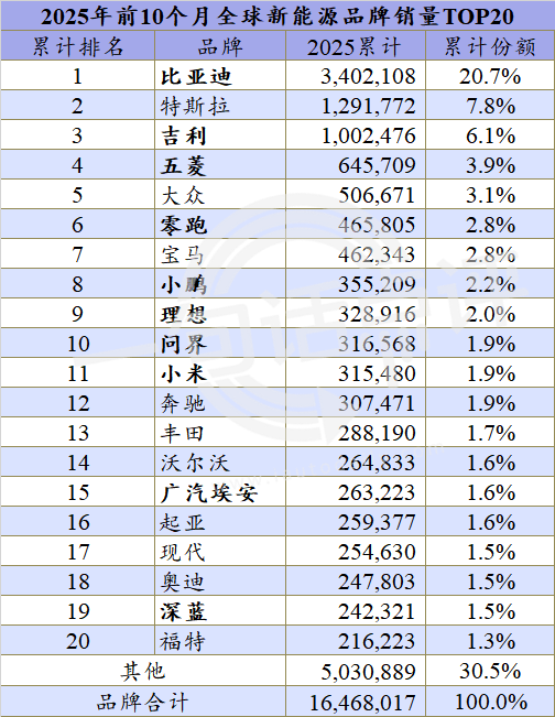 跟隨著車型榜的變化,10月和前10個月全球新能源熱銷品牌榜單也出現了一些變動。