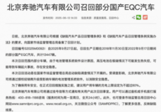 更嚴重的是,奔馳電動車還深陷“自燃門”與“召回門”。據不完全統計,奔馳電車在最近一年多時間里被曝出的“自燃”事故不少于10例。2025年6月,奔馳宣布召回13447輛奔馳EQC,原因是電池管理系統軟件設計缺陷,可能導致車輛起火。