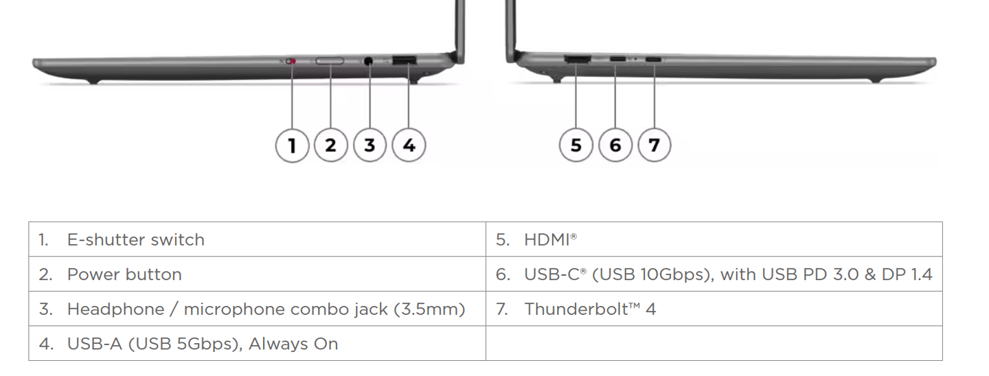 此外,新款電腦還板載 LPDDR5x-7467 內存,電池容量 73Wh,重 1.49kg / 1.59kg,厚度 16.6mm,IT之家附接口配置如下: