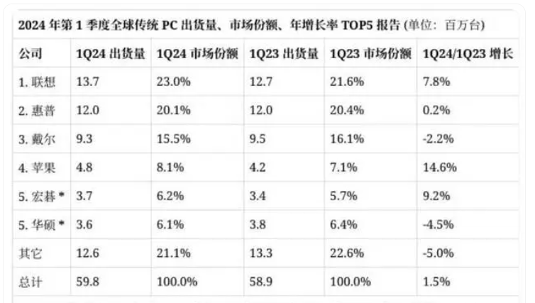 盡管華為在本土市場“擠進”了前三。但是放在全球市場,頭部品牌市場份額排行榜單上,華為卻幾乎榜上無名。例如,據前不久IDC發布的2024年Q1全球PC銷量數據,可以看到聯想、夏普、戴爾位列前三名,份額分別是23%、20.1%、15.5%。而Top5品牌中,華為卻不見蹤影。