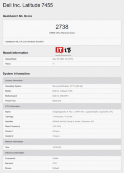 測(cè)試機(jī)為戴爾 Latitude 7455,主板型號(hào) 0NG0W1,采用 16GB 內(nèi)存,搭載 Windows 11 Pro 操作系統(tǒng),在 Geekbench ML 測(cè)試中取得了 ONNX CPU 2738 分的成績(jī)。