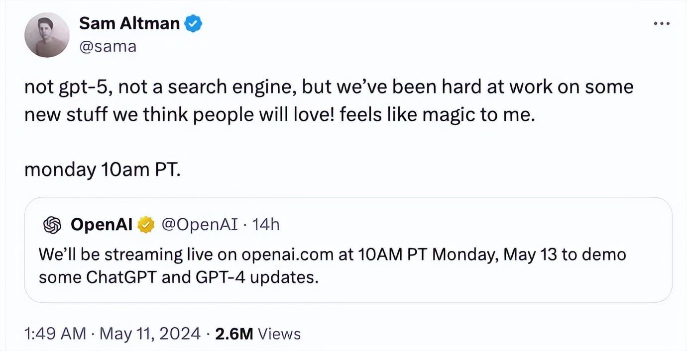 OpenAI首席執(zhí)行官Sam Altman在X上表示,這次的發(fā)布會,公司不會宣布下一代對話式人工智能GPT-5或人工智能驅(qū)動的搜索引擎。