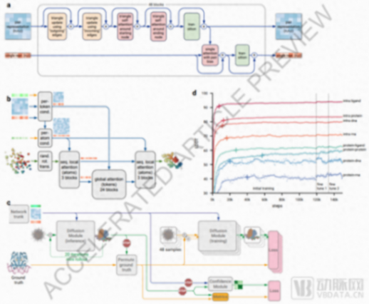 這些能力的升級來源于AlphaFlod 3新引入的主要組件,包括升級版的Evoformer模塊(現為Pairformer 模塊)、全新的Diffusion Network等。其中,Diffusion Network從點云通過概率擴散預測坐標,進而實現了更高的預測精度。