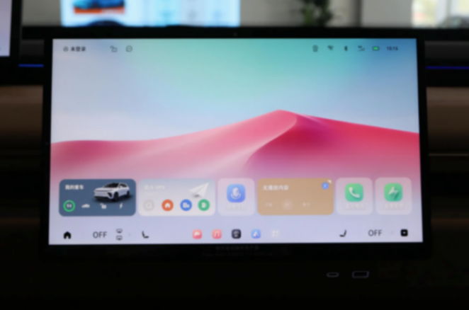 星紀元ET的中控臺與車門板擁有環抱式的接合設計,同時與中央扶手區形成了斷開結構,臺面與門板采用深淺組合的面料配色,與主打居家氛圍相貼近。貫穿式出風口劃分出臺面上下區域,中部位置配有一塊懸浮式中控屏,觸控模式讓實體按鍵數量大幅減少,中央扶手區以便利性為主,配有無線充電板和儲物格。儀表臺采用偏前置的液晶橫屏顯示,能為駕駛員提供更豐富的行車信息顯示。