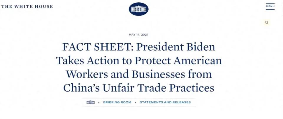5月14日,美國發布了對華加征301關稅四年期復審結果。其中,最為引人關注的莫過于其在原有對中國電動車征收25%關稅基礎上,進一步將相關關稅提升至100%;用于電動汽車的鋰離子電池及其零部件的關稅將從今年的7.5%躍升至25%。此外,包括光伏電池、關鍵礦產、半導體以及鋼鋁、港口起重機、個人防護裝備等產品在內悉數都是美國這次加征關稅的對象。