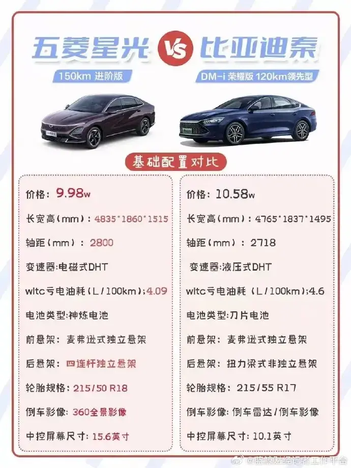 尺寸上,五菱星光長寬高分別是4835/1860/1515mm,軸距2800mm,比亞迪秦PLUS DM-i長寬高則為4765/1837/1495mm,軸距2718mm。