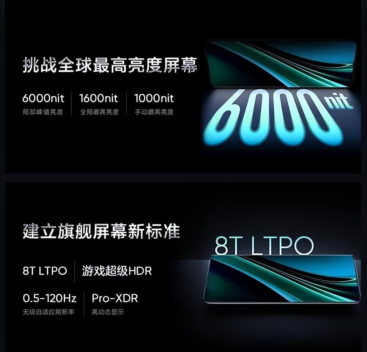 該機主打將首發搭載新一代無雙屏,局部峰值亮度達到6000尼特,全局最高亮度 1600尼特,強光環境依然清晰可見,全亮度下高頻調光,并自定義最低亮度,8T LTPO技術支持0.5-120Hz的無級自適應刷新率