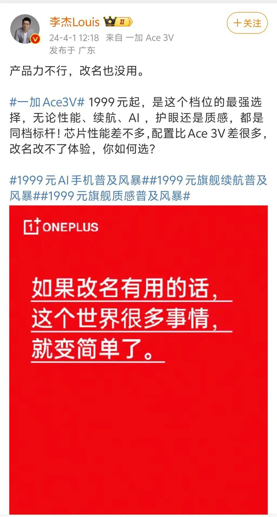 紅米和一加在手機(jī)圈你來我往誰也不讓誰這不,紅米宣布新系列,而一加總裁李杰說:產(chǎn)品力不行,改名也沒有用評論區(qū)也是十分熱鬧