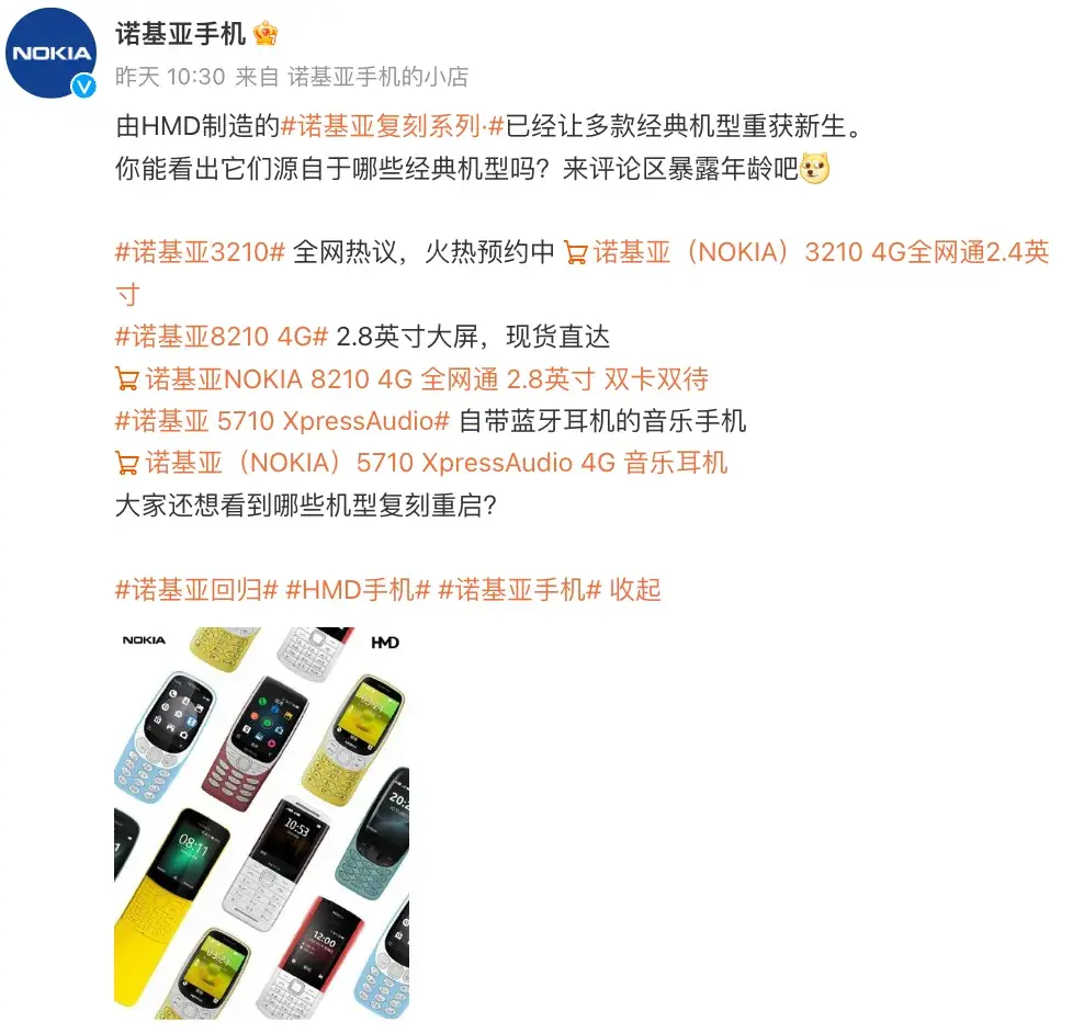 而且官方還在“諾基亞手機”微博上介紹了一下目前已經有多款復刻系列手機在賣了,同時還親切的詢問老爺們還想看到那些機型出復刻版。