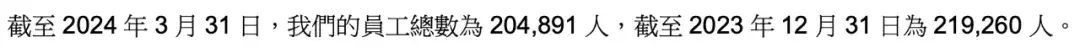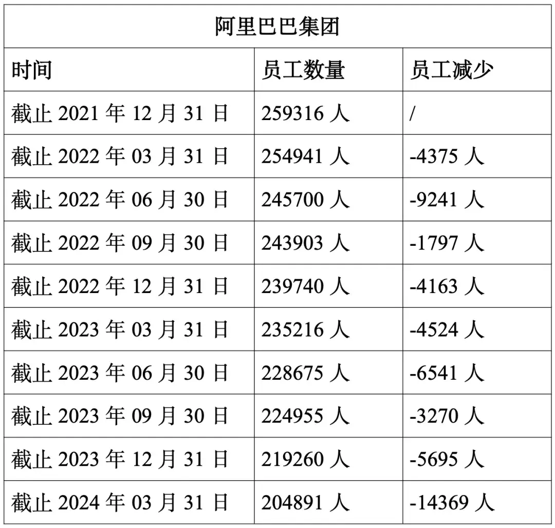 2024 年 1 月 1 日至 2024 年 3 月 31 日,阿里巴巴一個季度減少 14369 人: